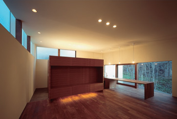騒音と視線を考慮して、車通りの多い北東前面道路側に対しては開口を極力抑えた上で、プランは南西の山側に開き、デッキテラスを持つ中庭を設けた。内部は使い勝手の良い回遊動線を持つオープンなプラン。高さを抑えた壁や家具によって間仕切ることで、空間に奥行きとフレキシビリティを持たせた。内部空間は山へと開いた中庭とテラスごしに一体となり、30坪を遙かに超えた拡がりと、表通りの喧噪を感じさせない静けさをもった住まいとなっている。