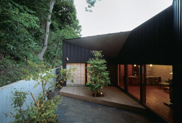 EDGE HOUSE:西側外観夕景。内部空間は、深い庇をもつテラスを介して、雑木林とつながる。